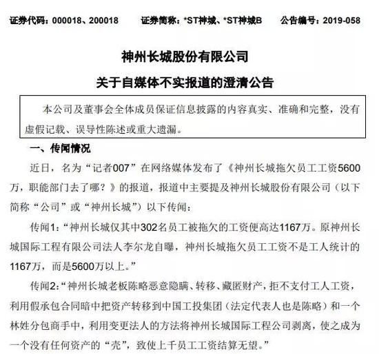*ST神城5月14日发布了“关于自媒体不实报道的澄清公告”,就近日“记者007”在网络媒体发布了《神州长城拖欠员工工资5600万,职能部门去了哪?》的报道作出澄清。