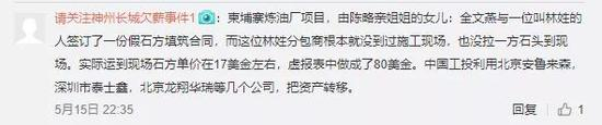 网友表示,柬埔寨炼油厂项目,由陈略亲姐姐的女儿:全文燕与一位叫林姓的人签订了一份假石方填筑合同,而这位林姓分包商根本就没到过施工现场,也没拉一方石头到现场。实际运到现场石方单价在17美金左右,虚报表中做成了80美金。中国工投利用北京安鲁来森,深圳市泰士鑫,北京龙翔华瑞等几个公司,把资产转移。