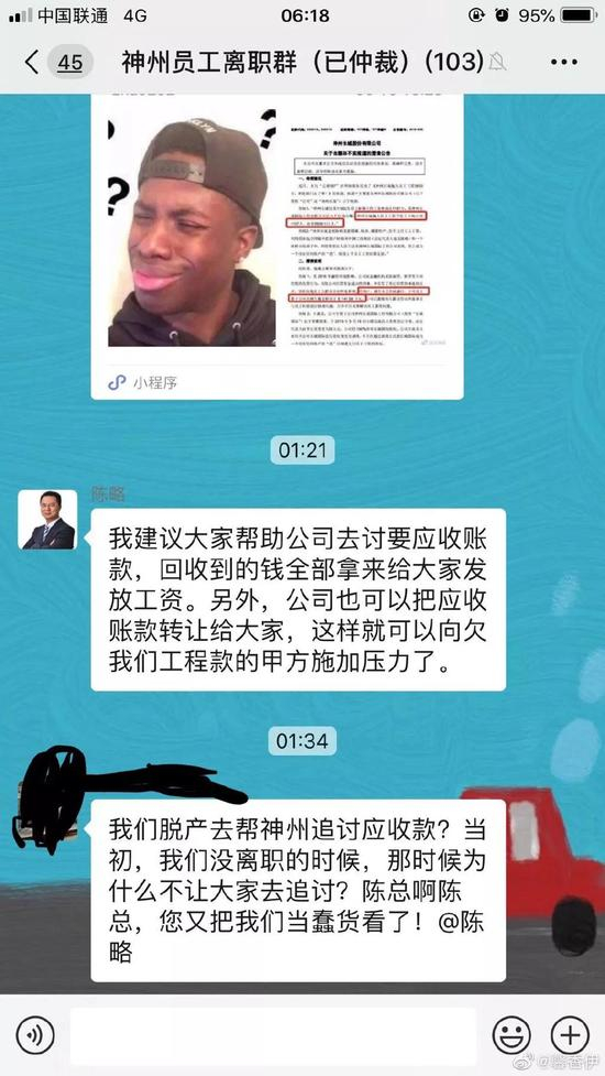 网友爆料称,公司实际控制人陈略在神州离职员工的微信群里表示,建议大家帮助公司去讨要应收账款,回收到的钱全部拿来给大家发工资。另外,公司也可以把应收账款转让给大家,这样大家就可以向欠工程款的甲方施压了。