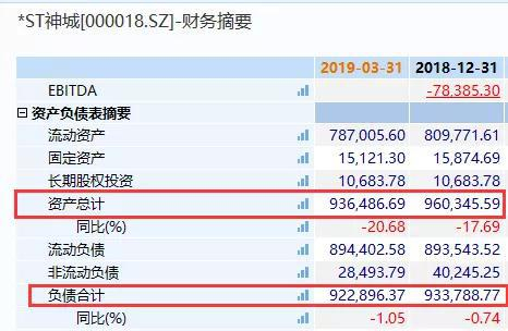 根据*ST神城2018年年报和2019年的一季报显示,截止到2019年3月31日,公司总资产93.6亿元,而负债合计92.3亿元,已经接近资不抵债的边缘。