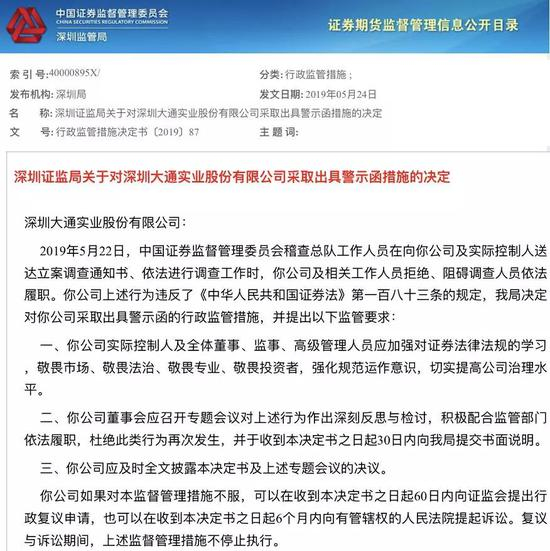 24日晚间,深圳证监局对深大通出具警示函,要求公司实际控制人及全体董事、监事、高级管理人员应加强对证券法律法规的学习,敬畏市场、敬畏法治、敬畏专业、敬畏投资者,强化规范运作意识,切实提高公司治理水平。积极配合监管部门依法履职,杜绝此类行为再次发生。