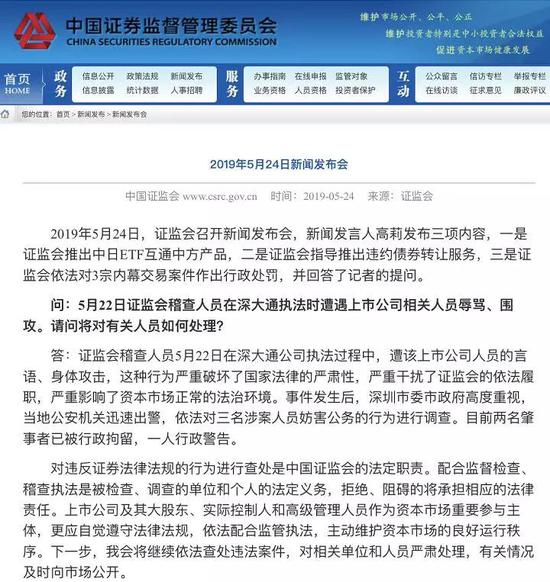 证监会稽查人员5月22日在深大通公司执法过程中,遭该上市公司人员的言语、身体攻击。高莉表示,这种行为严重破坏了国家法律的严肃性,严重干扰了证监会的依法履职,严重影响了资本市场正常的法治环境。事件发生后,深圳市委市政府高度重视,当地公安机关迅速出警,依法对三名涉案人员妨害公务的行为进行调查。目前两名肇事者已被行政拘留,一人行政警告。