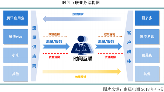 除了做品牌授权的现代服务业务外,南极电商还是2017年收购了一家做移动互联网营销的北京时间互联网络科技有限公司。就公开资料来看,时间互联虽然归类为移动互联网营销公司,但他的本质也是一家中间商。时间互联先向VIVO、小米、腾讯应用宝等移动媒体投放平台集中采购流量资源,再与像拼多多、苏宁易购、蘑菇街等需要推广APP的企业合作,向他们分销流量资源,为其APP做推广。