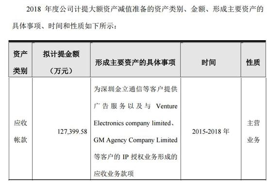 据印纪传媒此前回复深交所关注函的公告显示,印纪传媒2018年拟计提大额资产减值准备高达20.07亿元,所涉资产类别包括12.74亿元应收账款、1.27亿元其他应收账款、1.85亿元存货和4.21亿元预付账款。其中,占比超过60%的应收账款与去年宣布破产的金立集团有关。最终年报,却只披露了总额,对于具体的资产减值只字未提。