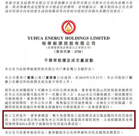 昨天收盘裕华能源大涨61%,今天该股涨势更为惊人。裕华能源盘中涨幅一度飙升至216.46%。截至下午收盘,该股收涨175.95%,居涨幅榜首位。股价的大幅波动引起了董事会的注意。裕华能源在5月27日晚连忙发出公告,声称自己不清楚股价大涨的原因。不过在公告中,公司透露了股价大涨的潜在驱动因素。