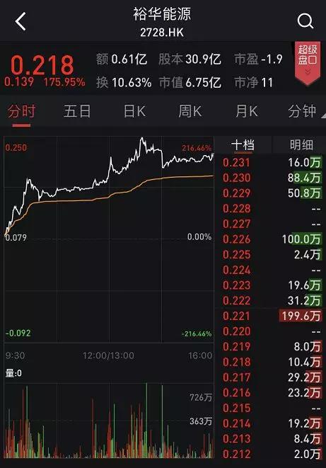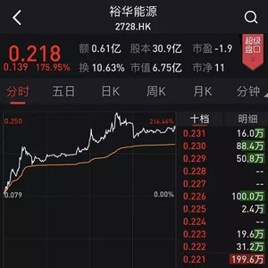 港股裕华能源今日开盘后迅速拉升,40分钟后涨幅曾达到146.8%。之后小幅回落,但截至午间收盘涨幅仍有116.46 %%,报0.171港元。下午开盘后该股涨幅进一步扩大,盘中一度大涨216.46%。截至下午收盘,裕华能源收涨175.95%,股价报0.218元,最新总市值6.71亿港元。