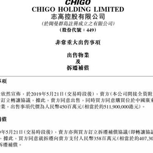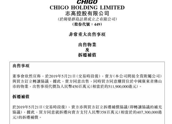 5月21日,志高控股(00449)发布公告称,于2019年5月21日,卖方(广东志高空调有限公司,公司间接全资附属公司)与买方粤港澳大湾区产融资产管理有限公司订立转让协议,据此,卖方同意出售位于中国广东省佛山市的物业,出售事项代价为人民币4.5亿元。同时,卖方获得拆迁补偿3.58亿元人民币。