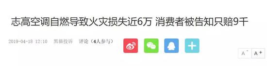 4月16日,汕头的一名网友在黑猫投诉反映称,2019年4月3号下午1点,她家的志高空调内机在没有工作情况下产生自燃导致火灾,衣物床套衣柜等物品全部烧毁,家人也因救火导致肺部感染住院。事后,志高空调售后核对损失资料,消费者粗略统计损失近6万元,4月10日,志高空调售后负责人告知消费者只赔9千。