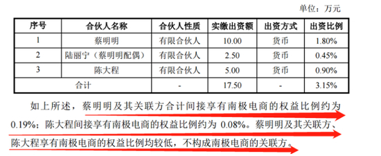 更有意思的是,这两家南极电商曾经最大的合伙经销商的法人代表陈大程和蔡明明,均通过公司股东丰南投资持有南极电商少量股权。