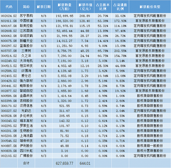 本周解禁规模最大的公司是苏宁易购。根据此前计划,公司6月6日将有19.27亿股限售股解禁上市,约合解禁市值208.89亿元,占公司总股本比例的20.70%。不过截至发稿时,公司仍未披露限售股解禁公告,具体解禁日期以公告为准。