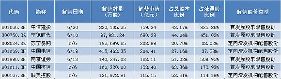 6月期间,共有7家公司解禁数量超10亿,中国电建(601669.SH)、中信建投(601066.SH)、苏宁易购(002024.SZ)、中国核建(601611.SH)、南京证券(601990.SH)、联美控股(600167.SH)、美都能源(600175.SH)。
