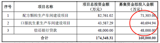 2019年4月29日,公司发布《公开发行可转换公司债预案》,预案显示,此次募集资金不超过16亿元,其中7.13亿元拟投入配方颗粒生产车间建设项目,4.07亿元拟投入口服抗生素生产车间建设项目,剩余4.8亿元用于偿还银行贷款。具体如下表: