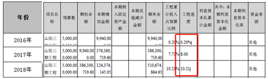 自2016年至2018年,该项目的工程进度分别为0.2%、8%、10.21%。这三年间该项目工程进度近完成仅一成左右,可见该项目进度极低。