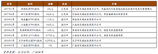 首先,从公司并购项目看。公司通过并购区域性的商业企业构建公司的医药商业体系。根据广证恒生整理发现,公司于 2017 年先后收购了润祥医药70%股权和百川医药 70%股权,实现河南、河北两个省份医药商业业务覆盖。同时继续并购优质区域商业公司,截至 2018 年底,公司已与广西医药、湖南鑫和、江西康力、青海新绿洲、北京四季汇通、昆明东方等六家公司签署了收购协议。上述收购不仅可以使得公司获得医药商业收入,还使得公司增强终端渠道能力。