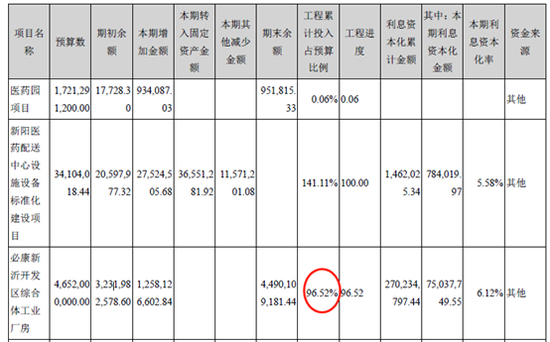 首先看必康新沂开发区综合体工业厂房项目。本项目总投资约为 46.52亿元,在公司借壳上市前,陕西必康已先期通过自有资金及银行贷款支付土地出让金及项目建设款合计约 17.68亿元,还剩下 28.84亿元的资金项目需求,公司计划使用募集配套资金 23.20亿元,余下约 5.64亿元的资金缺口上市公司通过债务融资等方式自筹资金解决。根据2018年年报发现,该项目工程进度已经到达96.52%。