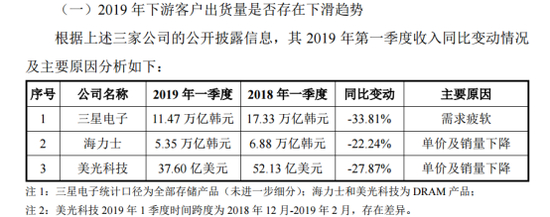 三星电子表示受主要客户去库存影响需求疲软,2019年一季度存储类产品收入同比下滑;海力士的DRAM产品其中单价下滑为主要原因;美光科技主要受移动通信市场季节性需求疲软和市场环境影响,造成DRAM产品单价下跌和销量的小幅下滑。