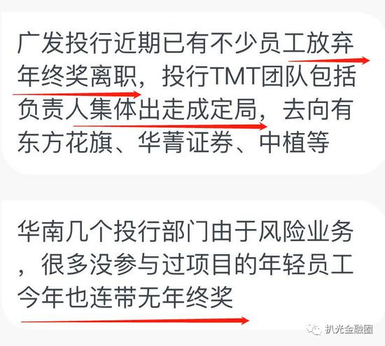 这样的背景下,不但广发高层日子难过,基层员工也如坐针毡,特别是投行部。妖哥接获的独家爆料显示,目前投行内部已有多名员工放弃奖金出走,在职的也是人心动摇。