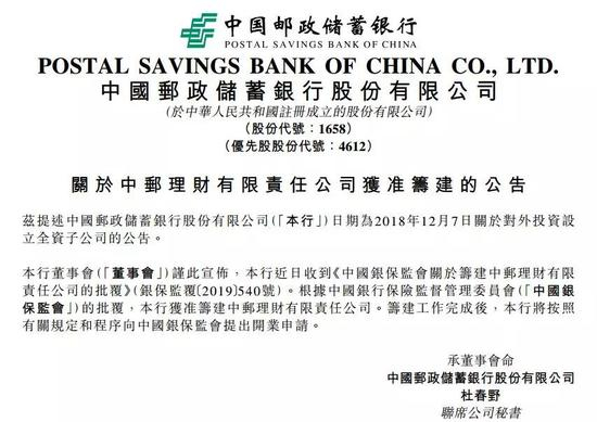 就在不到半个月前,邮储银行公告称,该行获准筹建中邮理财有限责任公司。筹建工作完成后,该行将按照有关规定和程序向中国银保监会提出开业申请。