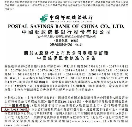 今天晚间,邮储银行在港交所公告,银保监会原则同意首次公开发行A股股票并上市,发行规模不超59.48亿股。