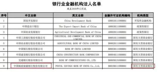 今年2月11日,银保监会在官网的信息披露栏目披露了最新的银行金融机构法人名单。之前一直被单独拎出来划分的邮储银行终于进入国有大型银行队伍,正式同工、农、中、建、交为伍。至此,中国国有商业银行扩容为6家。