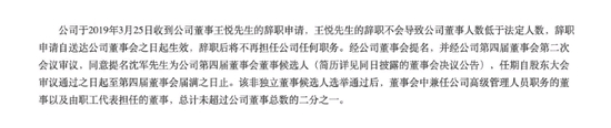 在失联之前,王悦与上市公司的最后一次联系,发生在3月25日。当天,公司收到了董事王悦的辞职申请,辞职后其将不再担任公司任何职务。