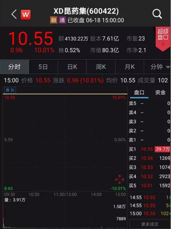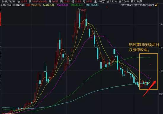6月18日开盘,昆药集团一字涨停。截至当日收盘,昆药集团报价10.55元,换手0.52%,39万手封单涨停。连续两日,昆药集团均以涨停收盘,市值增加13.9亿元。