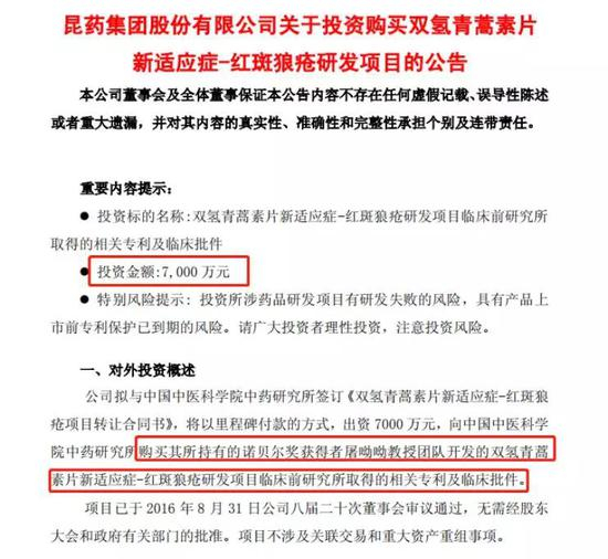 2016年9月,昆药集团与中医科学院中药研究所签订《双氢青蒿素片新适应症-红斑狼疮项目转让合同书》,上市公司出资7000万元,购买其所持有的屠呦呦团队开发的双氢青蒿素片新适应症-红斑狼疮研发项目临床前研究所取得的相关专利及临床批件。