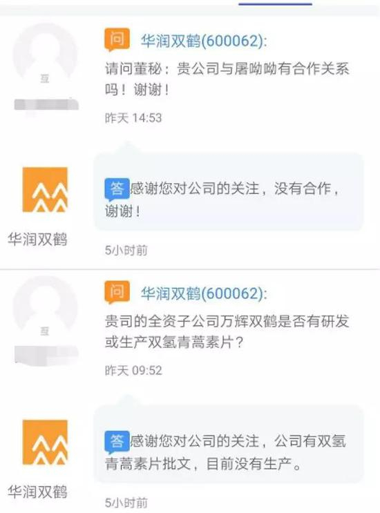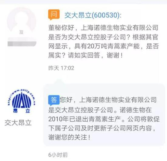 6月18日在投资者互动平台上,交大昂立表示,上海诺德生物实业有限公司是交大昂立控股子公司。诺德生物在2010年已退出青蒿素生产。同时,华润双鹤也在互动平台上表示,公司有双氢青蒿素片批文,目前没有生产。
