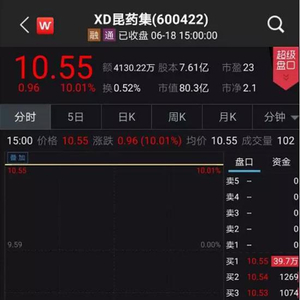 6月17日当天,昆药集团开盘以一字板涨停,报9.69元,封单超过100万手。6月18日开盘,昆药集团一字涨停,截至当日收盘,昆药集团报价10.55元,换手0.52%,39万手封单涨停。连续两日,昆药集团均以涨停收盘,市值增加13.9亿元。