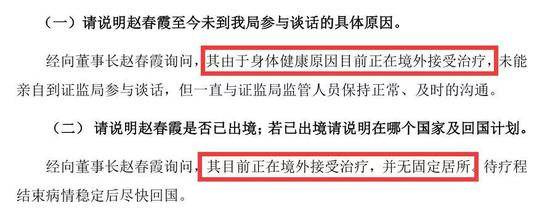 究竟赵春霞去哪里了?对此,公告表示,赵春霞已在国外。给出的解释为:“由于身体健康原因目前正在境外接受治疗”。