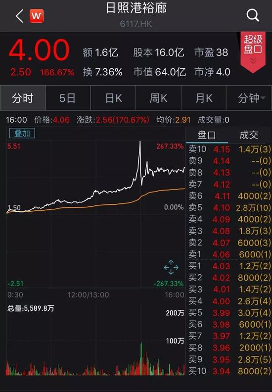 该股首日挂牌倍受追捧,早盘小幅高开后连续上攻。截至14时37分,日照港裕廊暴涨266.67%,创出上市首日盘中最高点,报价5.5港元,市值达88亿港元。该记录创下了香港市场的港口股首日上市的最好成绩。