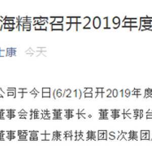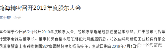 21日下午,富士康官方发布,经股东票选通过新任董监事成员,并于股东会后举行董事会推选董事长。董事长郭台铭本届任期在六月底届满后,将改由鸿海精密工业股份有限公司董事暨富士康科技集团S次集团总经理刘扬伟接任,生效日期自2019年7月1日。