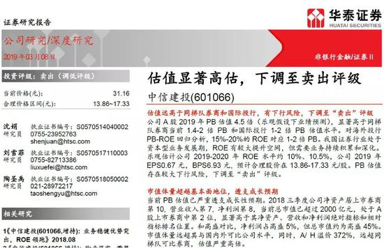 华泰证券在研报中表示,中信建投估值远高于同梯队券商和国际投行,有下行风险,下调至“卖出”评级。中信建投A股2019年PB估值4.5倍(乐观假设下业绩预测),显著高于同梯队券商当前1.4-2倍PB和国际投行1-2倍PB估值水平,预计合理股价在13.86-17.33元/股。