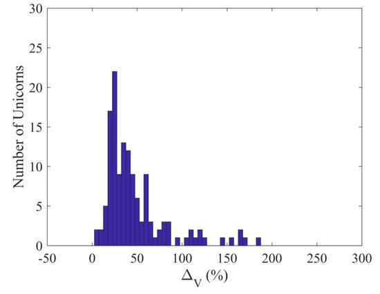 下图为独角兽高估的分布图,显示了主要样本中独角兽的高估率分布,ΔV是投后估值/公允价值的百分比,反应了独角兽估值被夸大的程度。
