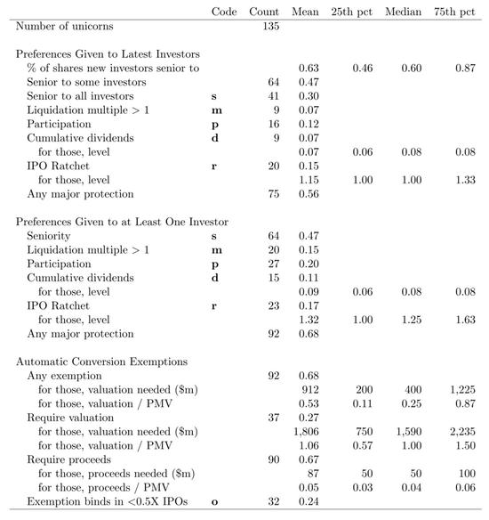 在斯坦福大学研究的独角兽样本库中,超过三分之二的样本,给予了最近一轮投资者一个或多个重要保护:有9只独角兽给予了所有最近一轮投资者超过1倍的优先清算倍数,最高的倍数高达20倍;有16只独角兽给予所有最近一轮投资者参与分配权,27只至少让他们的一位投资者拥有参与分配权;有20只独角兽给予了最近一轮投资者IPO棘轮条款;有92只独角兽给予了最近一轮投资者自动转换豁免权;有41只独角兽给予了新投资者对所有现有股东都更为高级的等级(Seniority)。