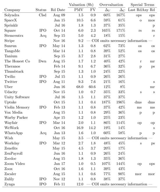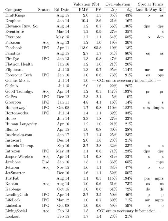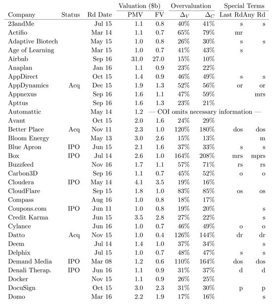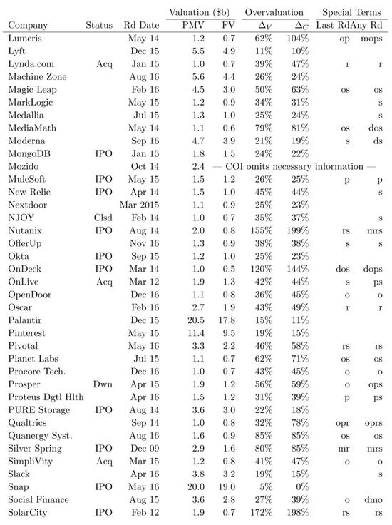 下面我们基于这篇论文,来分析估值是如何被夸大的。(详细的116家核心独角兽公允价值和投后估值表请见本文附录。)
