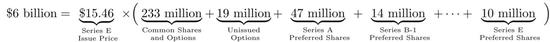 在投后估值的计算公式中,享受这些权利的Square E轮股权,和之前的A、B、C、D轮股权相加在一起,变成总股本(3.88亿股),再乘以E轮每股价格15.46美元,得到投后估值60亿美元。但其实这些股票都具有不同的现金流权利、清算权利、控制权和投票权。