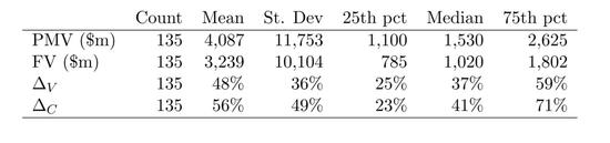 样本中独角兽公允价值和投后估值总览。几项指标分别为:投后估值(PMV)、公允价值(FV)、PMV夸大FV的百分比(ΔV)、PMV夸大普通股股价的百分比(ΔC)。