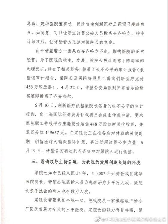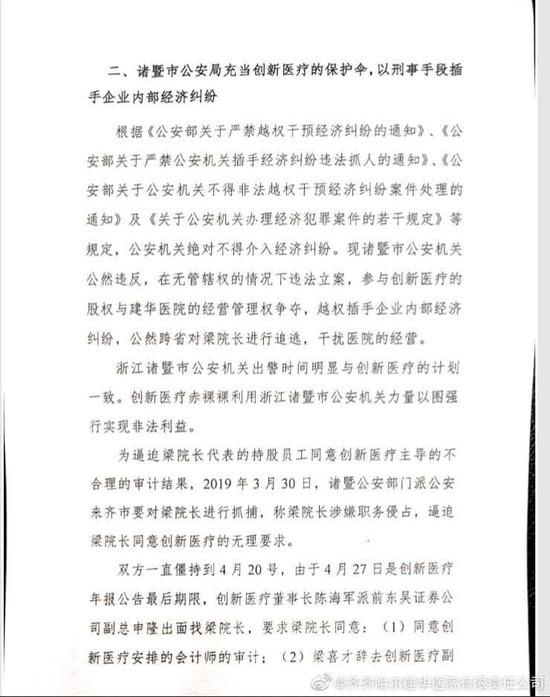 冲突的爆发点则是公司及建华医院高管被带走或被采取强制措施。4月,创新医疗公告,公司副总裁、财务总监吴晓明在赴建华医院协调审计工作期间,被齐齐哈尔市公安局建华区分局带走调查。目前,建华医院总经理、执行院长梁喜才因涉嫌犯罪被警方采取“监视居住”强制措施。
