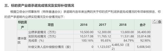 但创新医疗披露的数据显示,建华医院2017年、2018年并未完成承诺的业绩。6月14日,创新医疗发布公告,2018年,建华医院实现扣除非经常性损益后归属于母公司的净利润为1.15亿元,业绩完成率为84.79%。根据协议,2018年康瀚投资应支付补偿股份448.55万股。