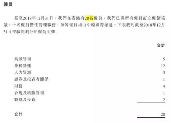 据招股书披露,截至2018年底中烟香港的28名雇员中,包括高级管理5名、业务营运12名、人力资源3名、证券及投资者关系1名、财务4名、合规及风险管理1名、战略及投资2名。