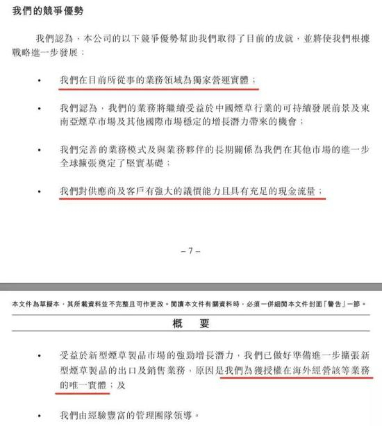 中烟香港在招股书中谈及“竞争优势”时表示:“我们在目前所从事的业务领域为独家营运实体。”“我们对供应商及客户有强大的议价能力,且具有充足的现金流量。”