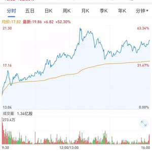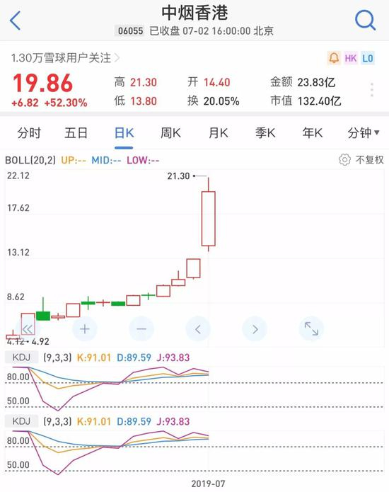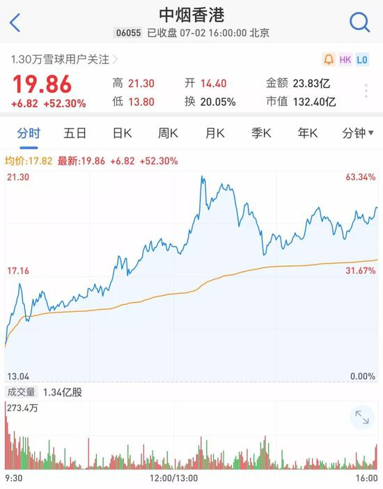 今日中烟香港涨势如虹,盘中一度创下21.3港元新高,截至收盘报19.86港元,一日涨幅达到52.3%。
