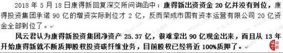 2018年5月18日康得新回复深交所问询函中:康得新出资资金20亿并没有到位,康得投资集团承诺90亿的增资实际到位才2亿,反而荣成市国有资本运营有限公司20亿资金全部到位了。