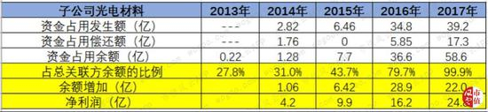 2017年资金占用的关联子公司为光电材料(光学膜业务),从光电材料的盈利情况来看,每年盈利都不少,2014年-2017年累计净利润55.1亿,理论上应该是现金牛公司,但却占用母公司资金58.6亿,让人不禁怀疑其账上现金和利润的真实性: