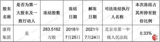2018年8月2日公告控股股东康得集团股份被冻结,冻结的股份数为0.33%,原因是与上海斐泉商务咨询事务所合同纠纷。