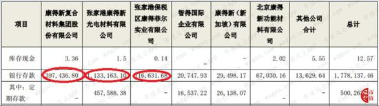 2017年账上185亿现金主要集中在三个公司:(1)张家港康得新光电材料有限公司(简称“光电材料”)账上有113.3亿;(2)康得新复合材料集团股份有限公司(合并报表的母公司)账上有39.7亿;(3)张家港保税区康得菲尔实业有限公司(简称“康得菲尔”)账上有11.6亿: