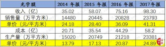 康得新财务总监王瑜在2017年5月19日股东大会中披露:显示类在一亿平米左右,平均单价在19-21元,装饰在8千多万平米,然后平均单价在25元左右上下波动,窗膜是2千万平米,价格是在80-90元之间,3D在1000万平米左右,然后平均单价在150-190元之间: