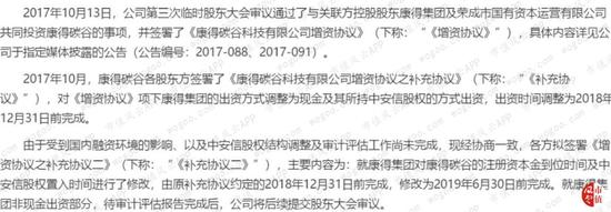 果然,2018年12月29日康得新公告,重新签署与控股股东康得集团及其他单位共同投资康得碳谷科技有限公司的《增资协议之补充协议二》,把出资时间延迟为2019年6月30日,把现金的出资方式变成“现金+中安信股权”。