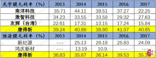 康得新毛利率异常之处在于:(1)整个公司相对同行业可比公司毛利率相对较高;(2)预涂膜业务的毛利率接近光学膜业务的毛利率,2016年居然还有所上升。